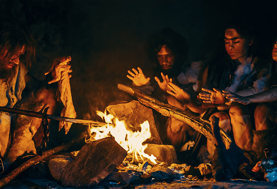 Man uses fire as a source of light and heat.